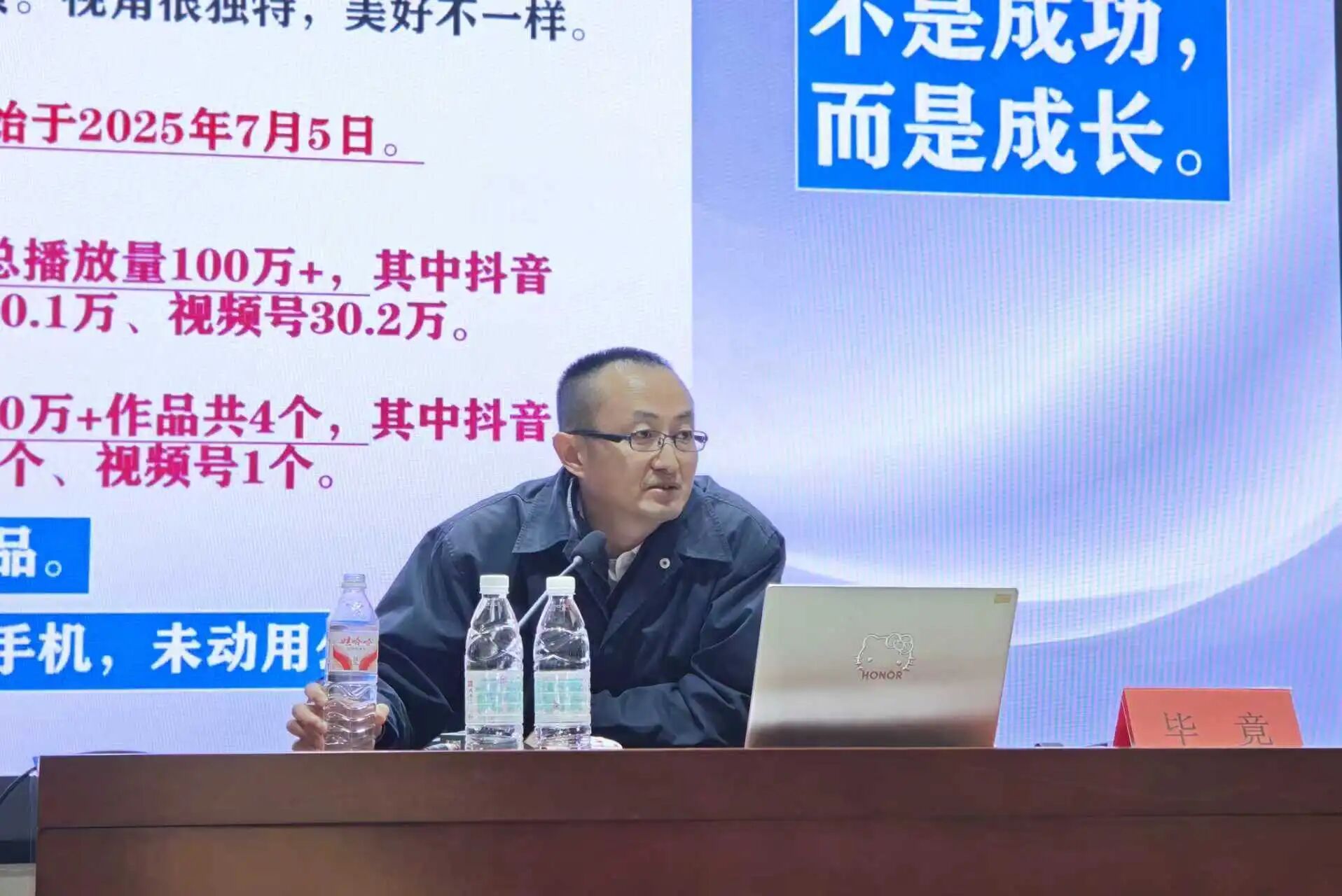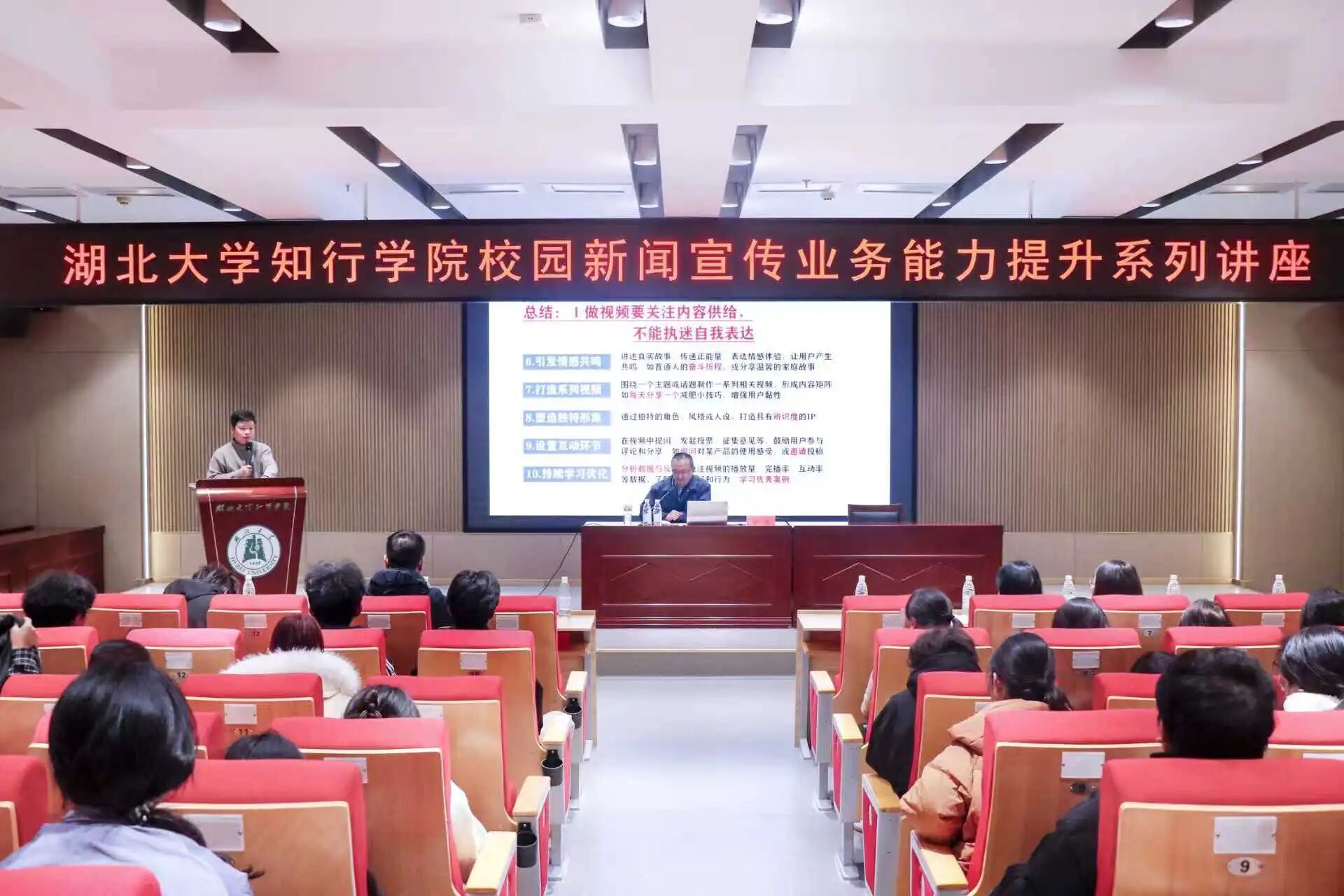 本网讯(通讯员:薛云琛 叶夏正 蒋俊杰)为加强校园新闻宣传队伍建设,提升师生新媒体素养与短视频创作能力,11月20日下午,由我校党委宣传部与人文学院联合主办的校园新闻宣传能力提升系列讲座第三讲在知远楼202报告厅举行。本次讲座特邀长江日报社高级编辑毕竟教授担任主讲,以“抓新闻点玩短视频,一年玩出100万+”为主题展开分享。学工处处长王刚、党委宣传部部长刘锐、学院院长徐江涛、副院长宋洁、相关专业教师及新闻学、广播电视编导专业、各学院宣传通讯员团队学生参加。