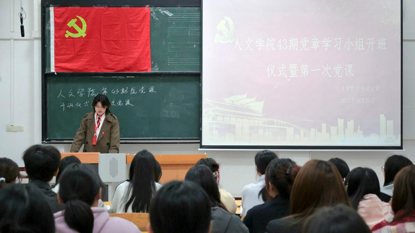 本网讯(通讯员:学生党支部)为扎实做好入党积极分子培养工作,引导青年学子筑牢信仰之基、补足精神之钙,10月21日,人文学院第43期党章学习小组开班仪式暨首次党课在庄严氛围中举行。学院第二、第三党支部全体支委及43期积极分子参加。仪式由支部委员王馨悦主持。