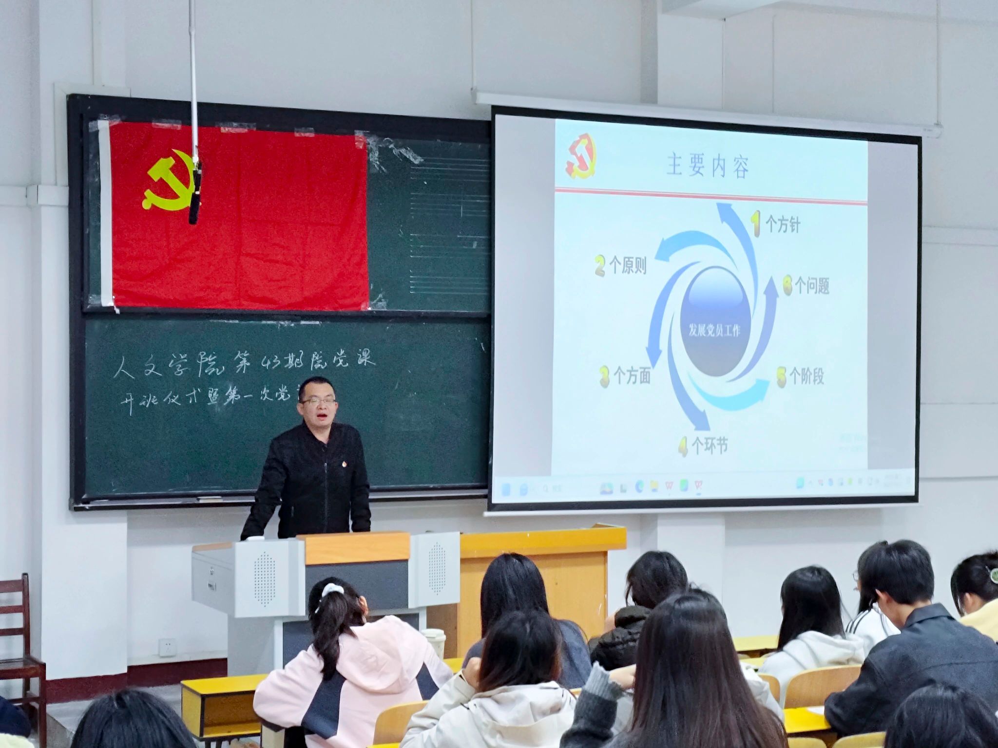 在开班第一课中,胡国毅老师以“深入领会党的创新理论”为主题,围绕“一个方针、两个问题、五个阶段、四个环节、三个方面、两个原则”的理论框架,结合党史中的重要事件和青年成长实际,对党的创新理论进行了系统解读。授课过程中,胡老师通过生动案例阐释了“两个确立”的决定性意义,引导学员增强“四个意识”、坚定“四个自信”、做到“两个维护”,为积极分子提供了坚实的思想指引。