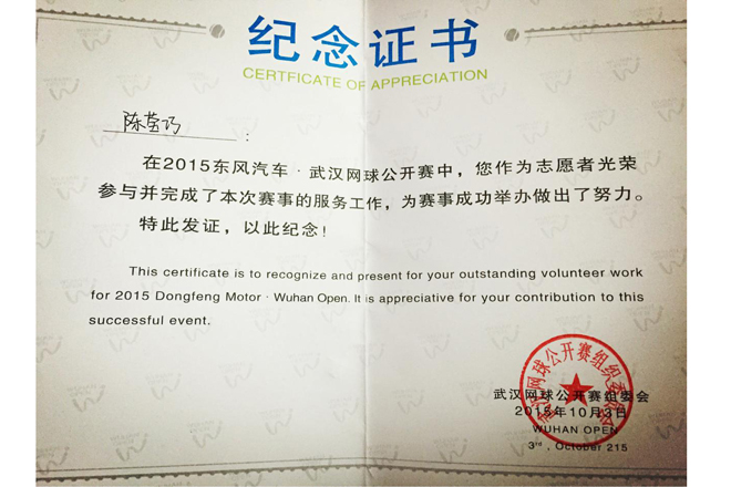 这在武网赛期结束后,凭借积极工作态度和志愿服务热情,陈莹巧受到了组委会高度赞赏和评价,并收获了武汉网球公开赛组委会颁发的志愿者纪念证书。