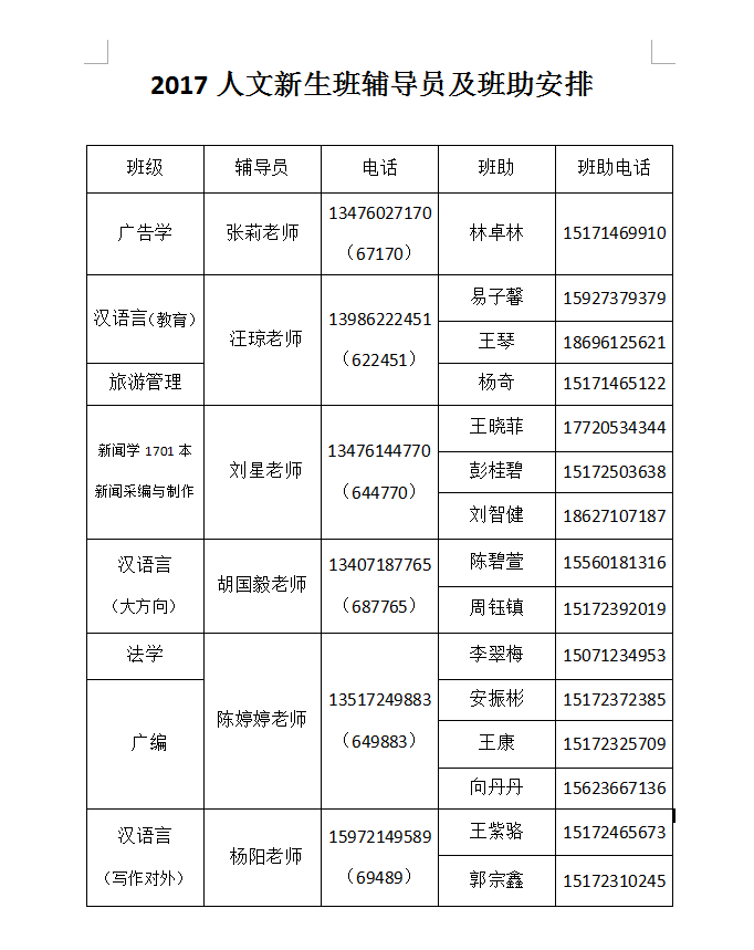 另附我系2017新生班辅导员信息及班主任助理信息: