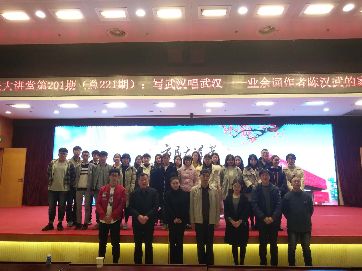 17日下午,陈汉武登台由市民之家与长江日报联合主办的第201期市民大讲堂,与来自武汉生物工程学院、湖北大学知行学院、武汉市行知小学和青山区街道社区的数百听众一道,分享了他业余创作诗词尤其是爱家乡、写家乡、唱家乡的故事。