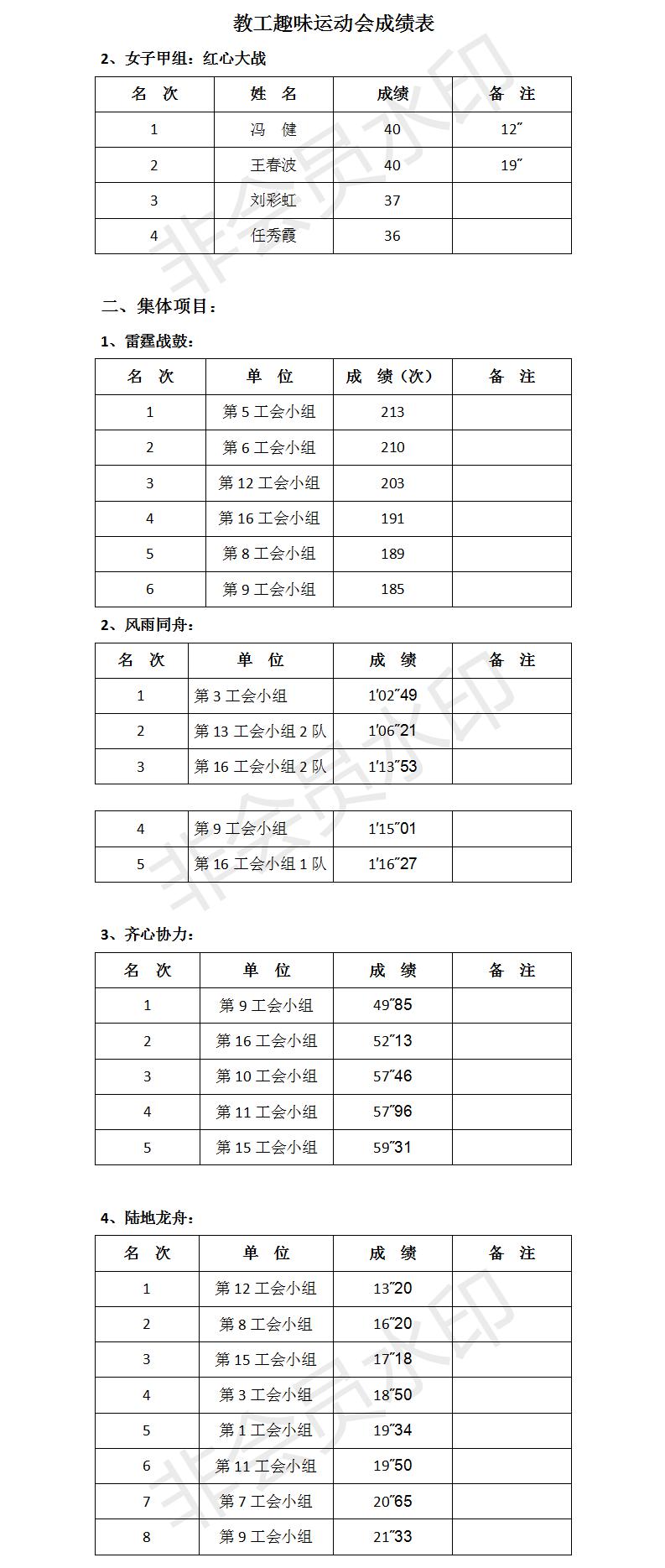 经过激烈角逐,第五工会小组获得雷霆战鼓集体项目第一名,第三工会小组获得风雨同舟集体项目第一名,第九工会小组获得齐心协力集体项目第一名,第十二工会小组获得陆地龙舟集体项目第一名。石松、胡振伟、程杰分获男子甲组红心大战前三名,冯健、王春波、刘彩虹分获女子甲组红心大战前三名,王刚、贺欢、刘锐分获男子乙组趣味飞镖前三名,马欢欢、管艳、余学梅分获女子乙组趣味飞镖前三名。