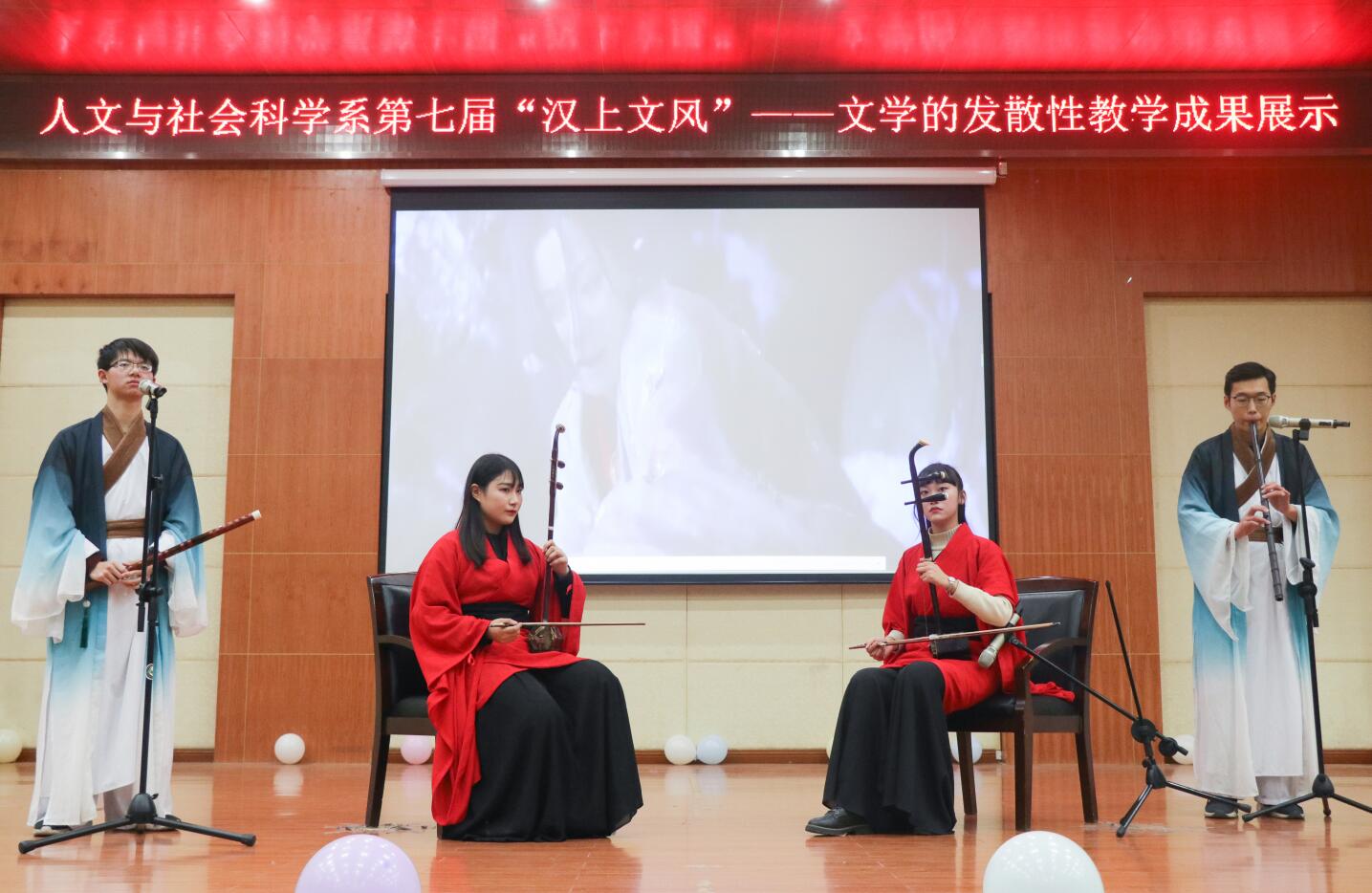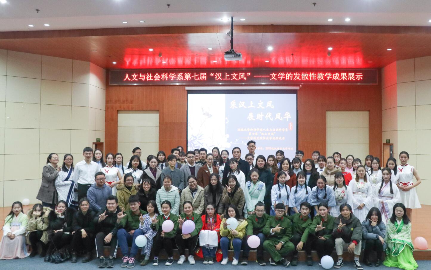 本网讯(通讯员 覃宇飞 冯馨晨)为更好展现文学魅力,点燃同学们对中国文化的热情,丰富校园文化生活。12月19日18时30分,人文与社会科学系在学术报告厅201举办以“采汉上之风,展时代风华”为主题的第七届“汉上文风”—文学的发散性教学成果展示活动。副院长王文凯、教务处副处长徐江涛、人文系主任任秀霞、人文系副书记冯姗、中文专业教研室主任金霞以及相关专业教师和辅导员老师出席。吸引了来自全院500名文学爱好者参加本次活动。