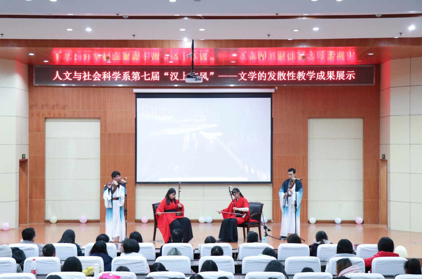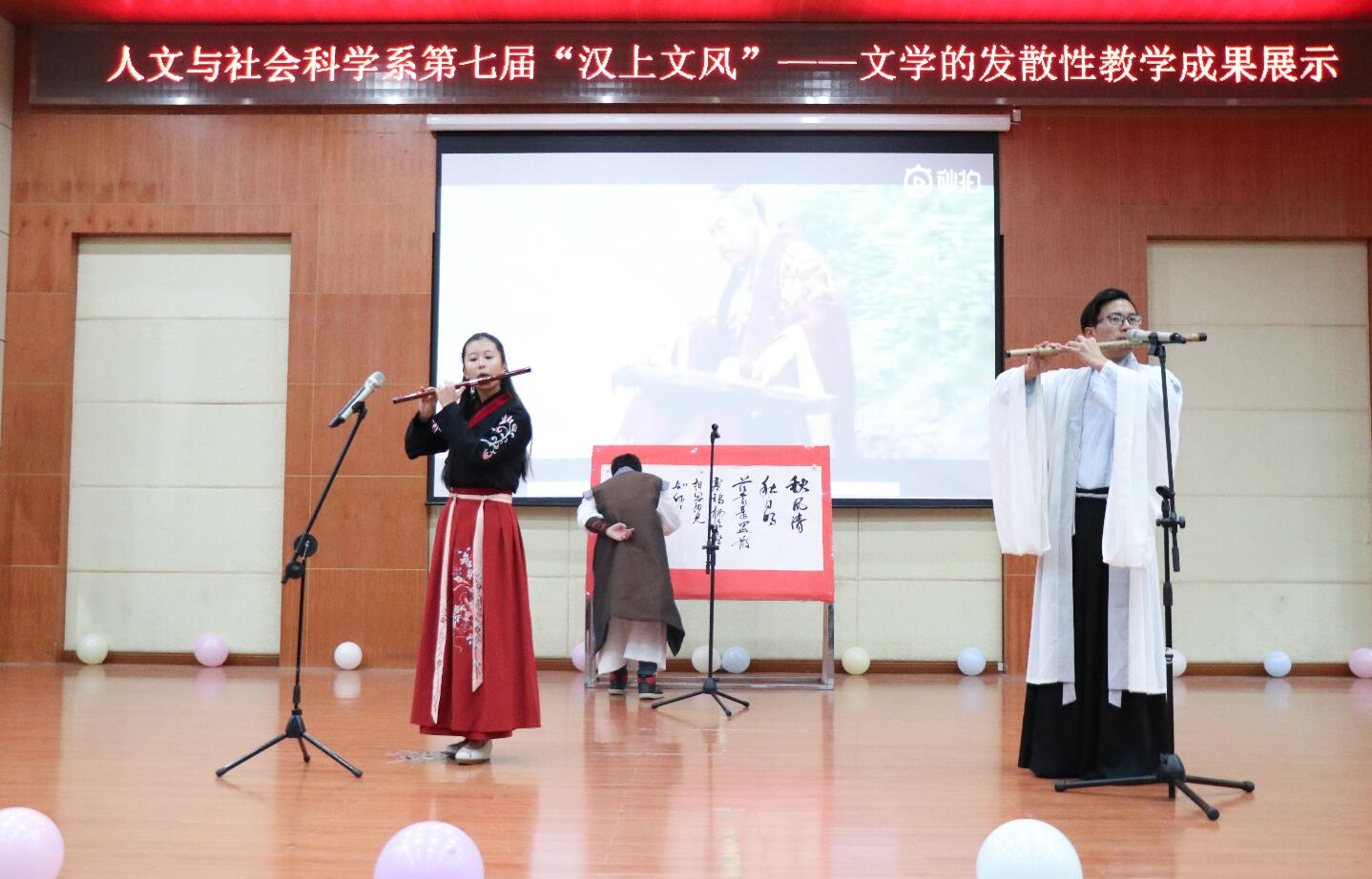 大楚网讯(通讯员 刘星 冯馨晨)12月19日,湖北大学知行学院人文系的一群汉语言文学专业学子举办了一场以“采汉上之风,展时代风华”为主题的“汉上文风”活动。旗袍汉服走秀、方言朗诵《再别康桥》、舞台剧演绎《桃花扇》、歌舞《关雎》……,受到该校师生广泛好评。