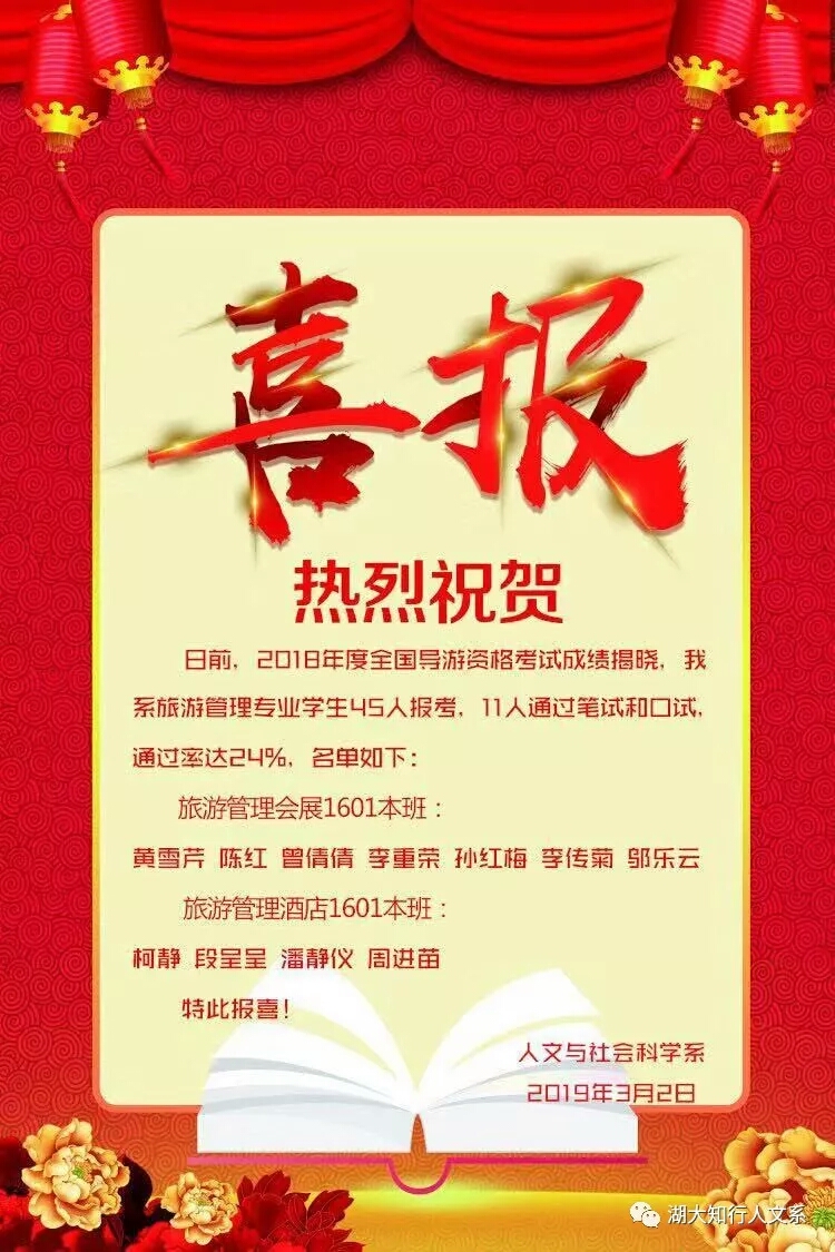 近日,2018年度全国导游资格考试成绩揭晓,我系旅游管理专业学生45人报考,11人通过笔试和口试,通过率达24%,特此报喜。