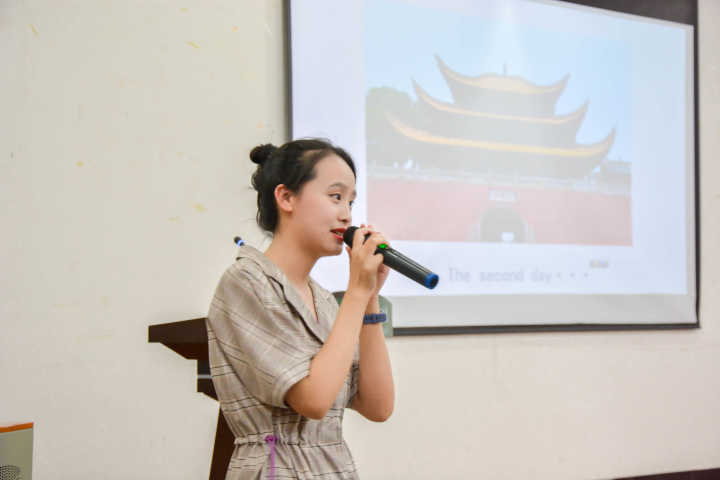 赵亚琪同学首先向同学们介绍了景德镇青花瓷样式的垃圾桶、古窑民俗博览区以及亲身做陶瓷的经历,用语言和图片向同学们展示了现代化的发达与古朴的文化共存的景德镇城市样貌,同时,借自己的亲身经历与同学们讲述了做陶瓷的工序,将瓷器工序之繁琐以及工匠精神传达给了在座的同学和老师们。赵亚琪还讲述了自己在岳阳排队背诵《岳阳楼记》以获得免费登岳阳楼的资格经历,其间,赵亚琪还和同学们积极互动,随机点同学接龙背诵《岳阳楼记》。赵亚琪通过古典诗歌意象解说了江南山水、雨花台边、紫荆山麓;英魂之刃,将士卫国,南京纪念馆的沉思,让我们体会到和平的珍贵;苏州园林里的一亭一台一阁都充分的展现出中国建筑的独有风情,赵亚琪用亲切的温温细语向我们解说着这里的古典故事,让人畅游其间;青岛之旅,夜爬泰山,游学之美,“登东山而小鲁,登泰山而小天下”。