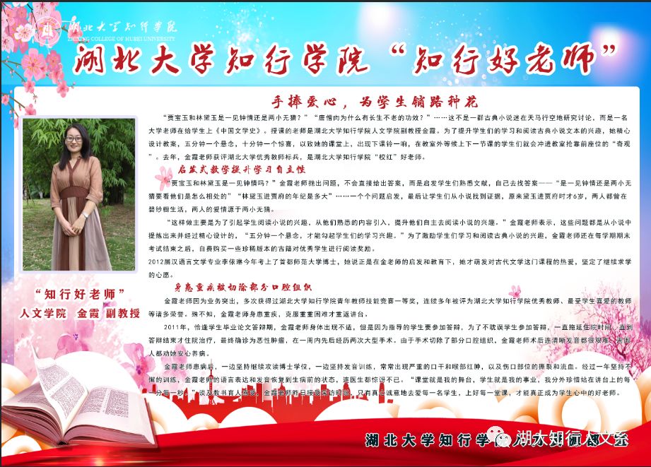 金霞老师因为业务突出,多次获得过湖北大学知行学院青年教师技能竞赛一等奖,连续多年被评为湖北大学知行学院优秀教师、最受学生喜爱的教师等诸多荣誉。殊不知,金霞老师身患重疾,克服重重困难才重返讲台。