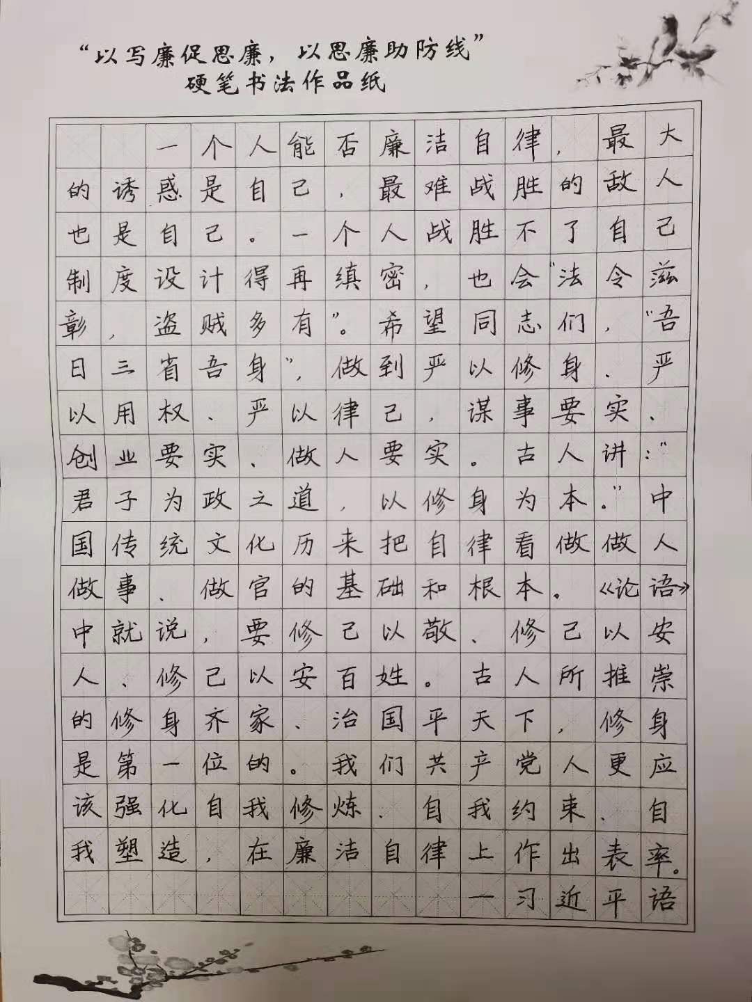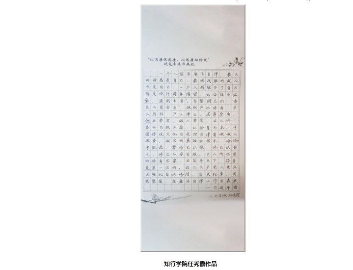 其中,由我院推荐的任秀霞院长硬笔书法作品《写廉篇》、刘星老师软笔书法作品《清白做人》篇、汉语言文学对外专业2017级徐潍同学绘画作品《廉》入选湖北大学廉洁文化作品展。