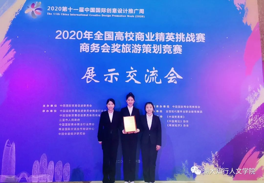 本网讯(通讯员:周嘉悦 姚晓佳 )2月3日—12月5日,2020年全国高校商业精英挑战赛商务会奖旅游策划竞赛全国总决赛在海南省三亚市红树林国际会议中心圆满落幕。在我院杨洋、杨阳两位老师的指导下,我院旅游管理专业的陈珊琦、袁玉琴、周嘉悦、潘玉四位同学组成的“奥利给队”学生队伍在全国总决赛中共获得全国总决赛一等奖和展洽会环节一等奖两项大奖。同时杨洋、杨阳两位老师也荣获优秀指导老师奖项,保持了参加该赛事以来的优秀成绩。