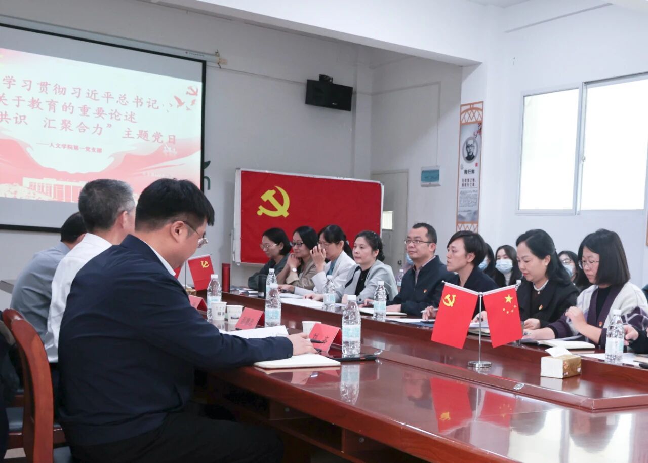 本网讯(通讯员:薛云琛 融媒体中心)10月29日,湖北大学知行学院人文学院第一党支部在知音楼402会议室开展“学习贯彻习近平总书记关于教育的重要论述——凝聚共识,汇聚合力”主题党日活动。活动由人文学院党总支书记冯姗主持,湖北大学指导督察组专职组织员彭德忠、审计处办公室主任曹毅,知行学院党委委员、副校长刘齐及支部全体党员教师参会。