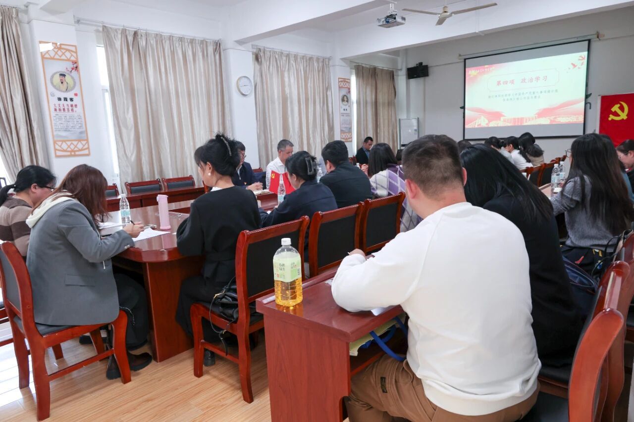 活动以庄严的重温入党誓词仪式开篇,迅速凝聚党员思想共识。全体党员集中观看了党的二十届四中全会新闻解读视频,深入领会全会关于十五五规划中对教育高质量发展的部署要求。第一党支部书记王少南领学《习近平谈治国理政》(第五卷)中“一体推进教育科技人才事业发展”重要论述,人文学院党总支组织委员徐江涛解读《中国共产党重大事项请示报告条例》核心要义,层层夯实理论学习基础。