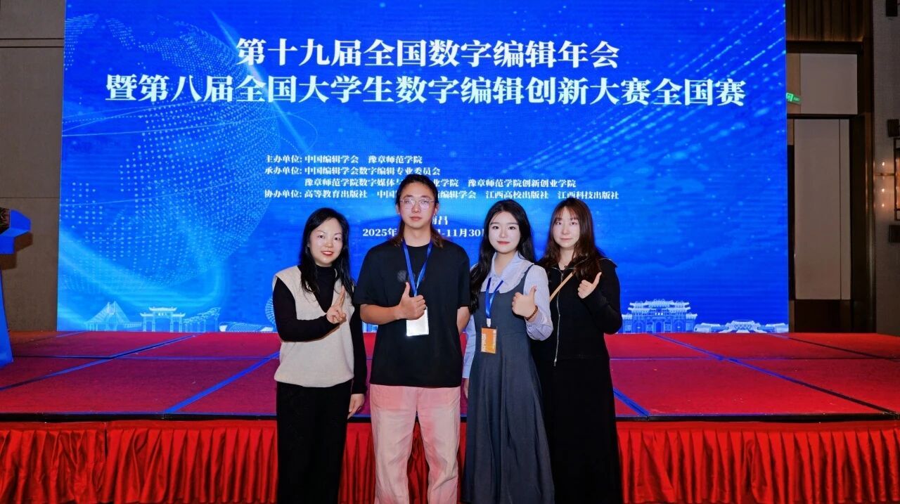 本网讯(石庄宜 苏菲娅 王艺琳)近日,第十九届全国数字编辑年会暨第八届全国大学生数字编辑创新大赛全国总决赛在江西南昌成功举办。在学院院长徐江涛和专业教师黄晶两位老师的指导下,广编2301班王艺琳、常玖翔等同学代表学校出战全国总决赛。他们凭借鲜明的创意表达与扎实的技术功底,在激烈竞争中脱颖而出,最终荣获全国总决赛二等奖。